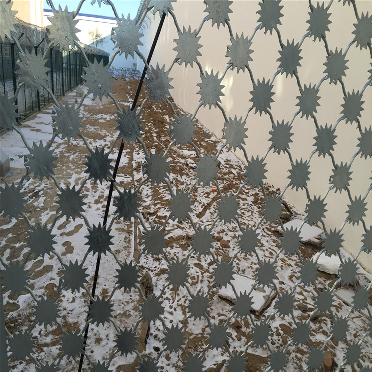 監獄太陽花刺鋼網墻 又叫沖壓刺隔離網、 太陽花刺片隔離網 ,行業內簡稱梅花刺網。其特點為堅固牢靠、防止攀爬等。 監獄太陽花刺鋼網墻 一般用于監獄大門,探監門,人員通道兩邊的隔離網…