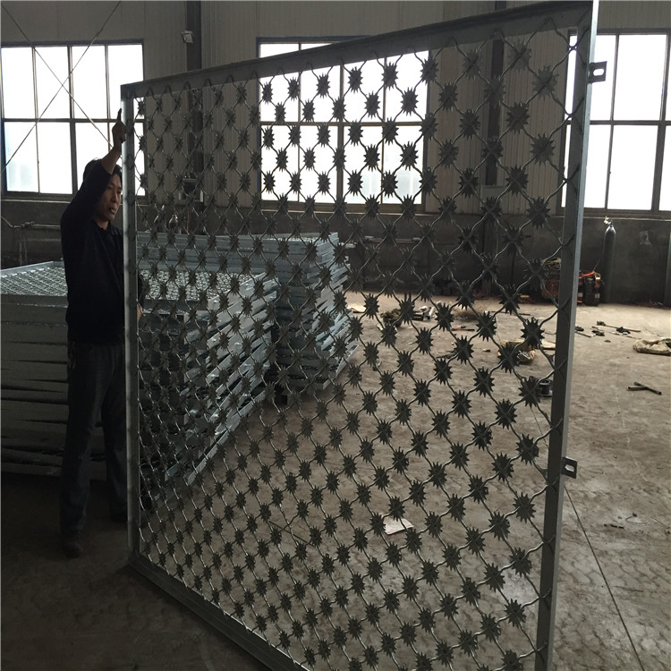 梅花刺片防護網 又名太陽花刺片隔離網,為太陽的后裔單層梅花刺片網,直徑不小于7.5cm,刺片厚1.5mm,采用Q235低碳鋼板沖壓成型。 2、 梅花刺片防護網 網片為菱形網…