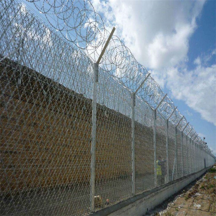 監(jiān)獄刺繩護欄網一般還會被稱為Y型安全隔離防護網,是由Y型支架立柱,加強型焊接片刺繩網片,安全防盜銜接件和熱鍍高鋅刀片刺繩組成強度和安全防護性等級很高的護欄網。
