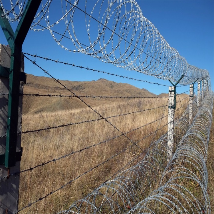 雙螺旋狀刀片刺網常規的是五十公分雙螺旋狀刀片刺繩適用范圍較多,其安裝簡單而且防盜效果好;像平鋪型刀片刺繩在制作工藝上與螺旋型有著很大的區別,它是將原件平鋪在工作臺上,擺好圈形和間距再進行卡扣加工,整體呈現平面結構,成品的造型為一個個圓圈相疊加。直條型刀片刺繩沒有卡扣,外包裝和一般的刀片刺繩都是一樣的,打開后可以直接拉成直線,也可以用校直機器做成段狀,在旅游勝地以及公園的圍欄處比較常見;焊接刀片刺繩網片周圍加上邊框起到固定作用,可有效的防止人員攀爬,通常與雙螺旋狀刀片刺網結合使用,在邊境線、監獄以及軍事重地等防護需求較高的地方比較常見。