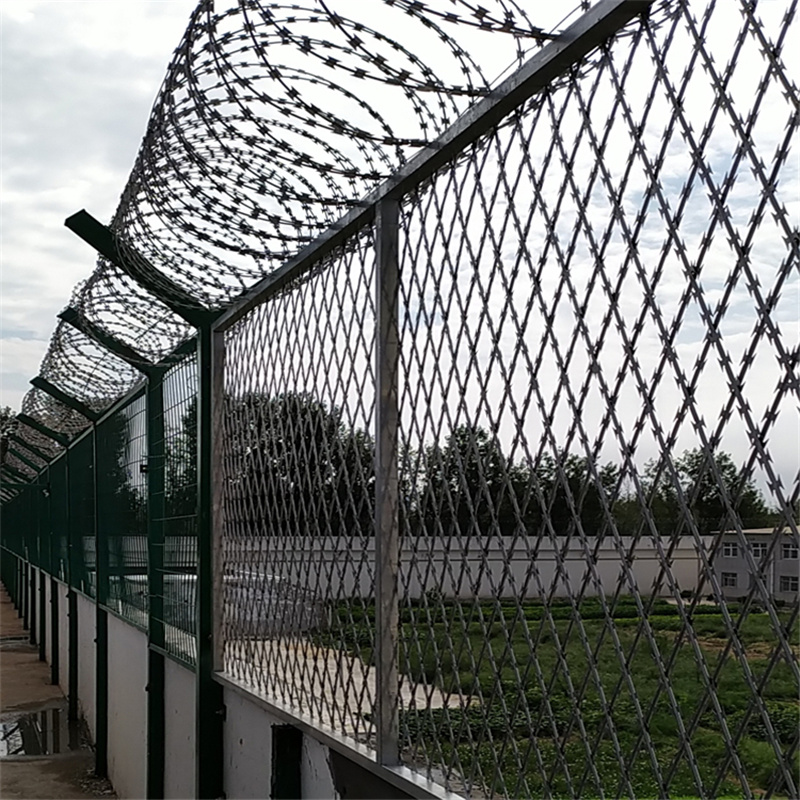 監獄圍墻專用隔離網主要是采用高強度的刀片刺網與普通防護網的結合,由V型支架立拄,加強型焊接片網,安全防盜連接件和刀片刺網組成。這樣的組合具有很好的嚇阻和防止攀爬的功能,選用優質原材料更是保障了隔離網的質量。
