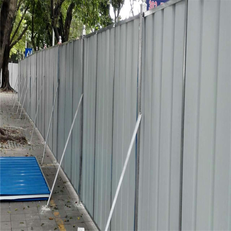 施工圍擋采用藍色輕質夾心彩鋼板,彩鋼厚度為0.3mm,高度2米,圍擋頂部及底部分別設置10cm高的鋼槽壓頂和鋼槽托底,每隔2.9米設一個錨固于地面的鋼立柱,立柱下座為50cm×50cm×50cm的C25砼基礎,鋼柱底板四角采用膨脹螺栓與混凝土基礎連接 固定,既可以減少占地,又可保證圍擋穩固、整齊、美觀。