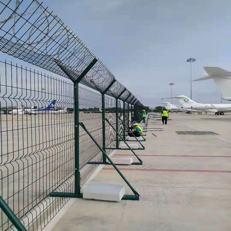 機場圍界區隔離網又稱作“Y型安全防御護網”,是由V型支架立柱,加強型焊接片網,安全防盜連接件和熱鍍鋅刀片刺籠組成強度和安全防御性級別很高。近年來,被廣泛應用在機場,軍事基地等高安全場所。注:如果在機場護欄網頂部加裝刀片刺絲、刀片刺繩后又很好的增強了安全防護性能。采用電鍍、熱鍍、噴塑、浸塑等防腐形式,具有很好的防老化、防曬、防候等特點。其產品造型美觀、花色多樣,既起到圍欄作用,又起到美化作用。由于具有安全性高、防攀爬能力好,網片連接方式采用特制SBS緊扣件,有效防止人為的破壞性拆卸,橫向四道折彎加強筋,使網面強度顯著增加。