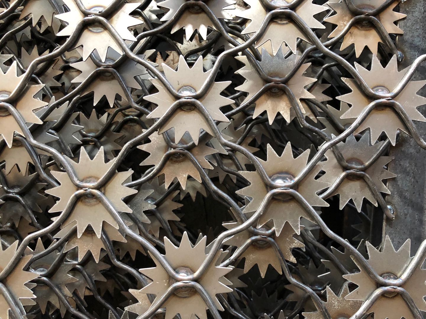 梅花刺網又稱監獄護欄網或監獄隔離柵,主要是采用高強度的刀片刺網與普通防護網的結合,由V型支架立拄,加強型焊接片網,安全防盜連接件和刀片刺網組成.刀片刺網是一種新型防護網,由銳利尖角鍍鋅鋼板或不銹鋼薄板做刀片,鋼絲做芯線組合而成的防護器材梅花刺網又稱高安全防護網、監獄防護網,是用氬弧焊將梅花形刺片焊接在美格網的節點上,形成刺形保護,有效的防止了手握腳攀,為此該鋼網墻在監獄或看守所使用。