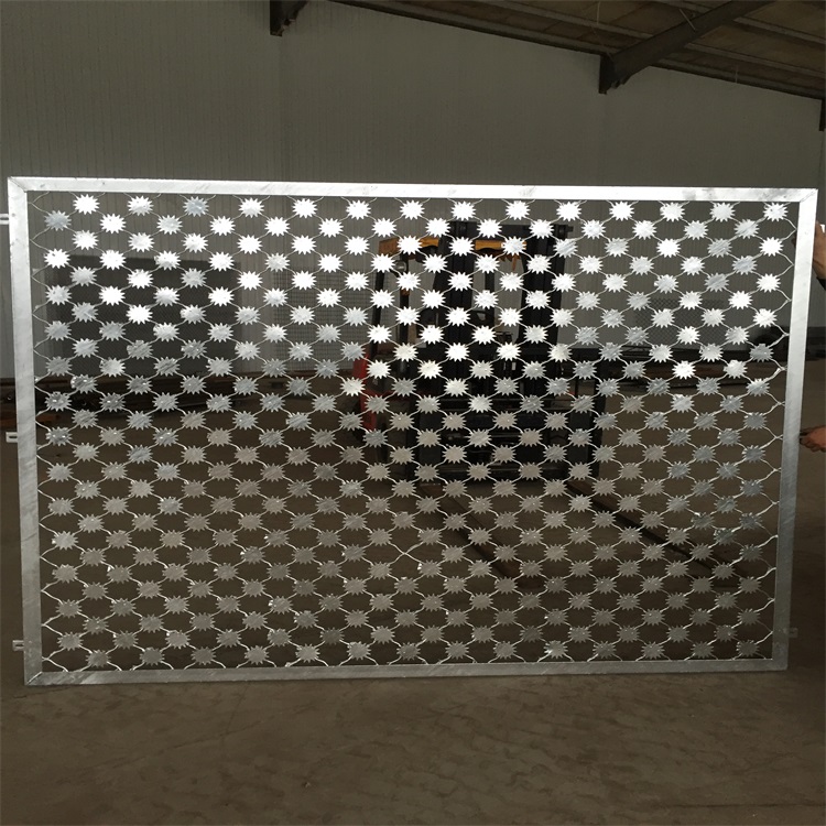 梅花刺監獄隔離網單網幅度為3000mm*4500mm,使用邊框為50*50*5mm角鋼和40*3mm扁鐵,將網絲、角鋼、扁鐵焊為一體;邊框與立柱采用螺栓固定邊耳式連接,邊耳均為60*60*6mm扁鐵,邊耳螺孔可調,調節距離不小于20mm;邊耳固定螺栓為直徑14mm*50mm全絲熱鍍鋅安全螺栓、螺母,每片網單邊連接點為8個以上。隔離網、立柱要求整體熱鍍鋅,上鋅量不低于300克,可做霧化試驗(附檢測報告),隔離網整體鍍鋅在內陸自然環境下,鋅層要求使用不低于10年。電動鋼閘門外框采用60mm*60mm*3mm(厚)方鋼,內框與網片邊框相同,門扇規格為5米*3米*2(高*寬),每單扇門中間加50*50*2mm橫襯方管,對開、平移。