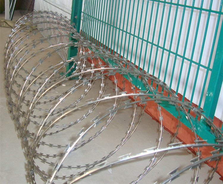 監(jiān)獄鋼網(wǎng)墻刺刀圈常用的規(guī)格是BT0-22型,刀片厚度:05±0.005、芯線直徑:2.5±0.1、刀長度:22±1刀寬度15±1刀間距:34±1。