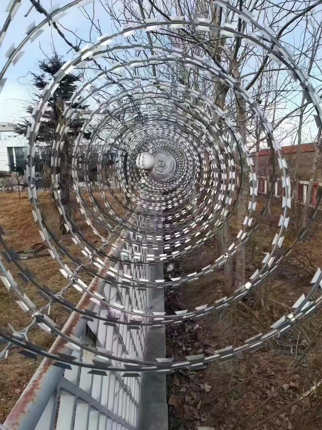 防盜防爬刺刺絲滾籠的主要材料是刺絲,刺絲是一種由高強度鋼絲制成的尖銳物品,具有很強的刺穿能力。刺絲滾籠的設計是將刺絲固定在一個圓柱形的滾筒上,當有人試圖攀爬或者翻越時,刺絲會刺入他們的身體,造成傷害,從而起到防盜防爬的作用。