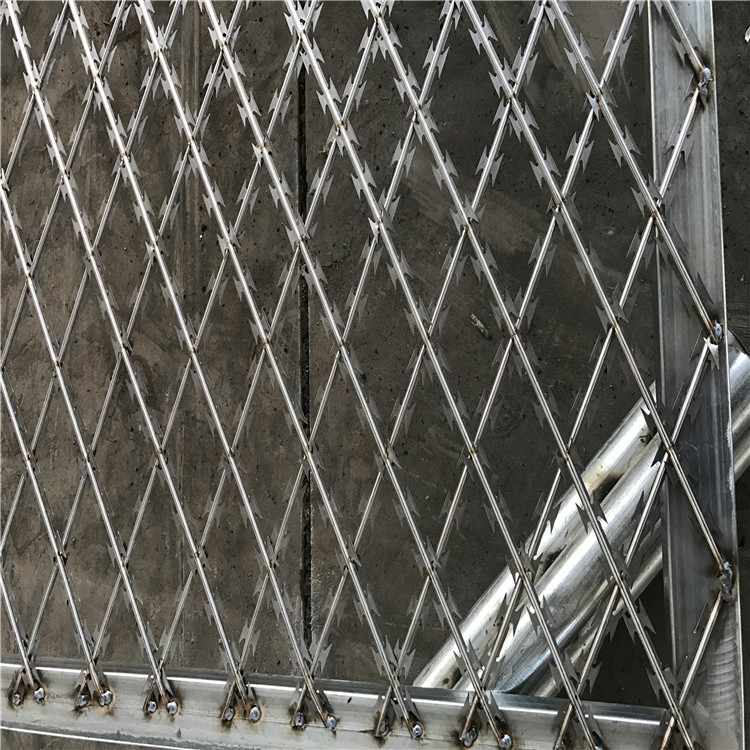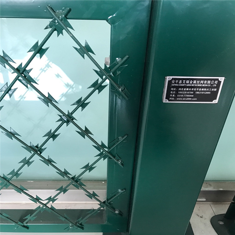 焊接刀片刺網邊框:監獄鋼網墻的框架選用優質矩形方管或者國標角鋼制作,常用規格有橫截面為30mm*50mm、20mm*40mm、30mm*30mm矩形方管,3#、4#、5#角鋼。