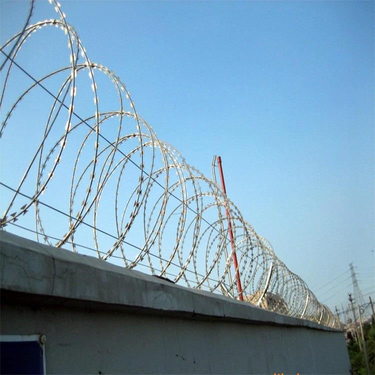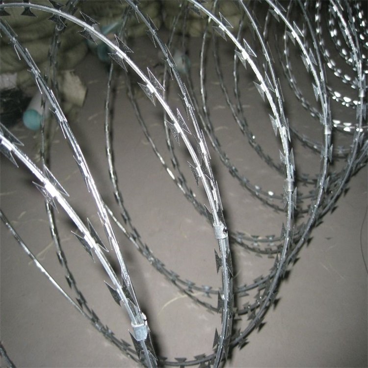 刺絲滾籠采用刀片刺繩繞圈后相臨兩圈每隔120°用刺絲連接卡固定,張開后形成蛇腹網狀,閉合后刀片刺繩圈徑為50cm,張開后每交叉圈安裝間距20cm,直徑不小于45cm。