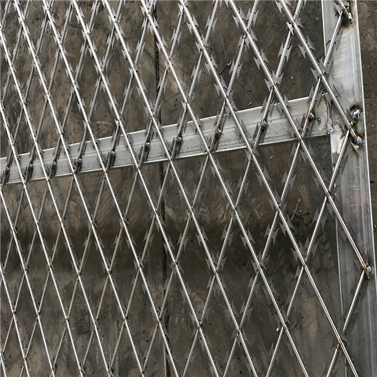 帶刺鋼絲護(hù)欄網(wǎng)分為刺繩護(hù)欄網(wǎng)和刀片護(hù)欄網(wǎng)刺繩護(hù)欄網(wǎng)是由低碳鋼絲表面鍍鋅擰編而成,毛刺鋒利使人難以穿越。刀片護(hù)欄網(wǎng)采用鋼板沖壓成型包附于鋼絲之上,由銳利尖角鍍鋅鋼板或不銹鋼薄板做刀片,高張力鋼絲做芯線組合而成的。鋒利的刀型刺由雙線扣裝后成蛇腹?fàn)睿让烙^又讓人不寒而粟。起到了很好的阻嚇作用。該產(chǎn)品具有美觀、防阻效果好、施工便利等優(yōu)點(diǎn)。廣泛用于軍事重地、監(jiān)獄、政府機(jī)關(guān)、銀行,以及生活小區(qū)圍墻、私人住宅、別墅的圍墻、門窗、高速公路、鐵路護(hù)欄以及邊境線等。