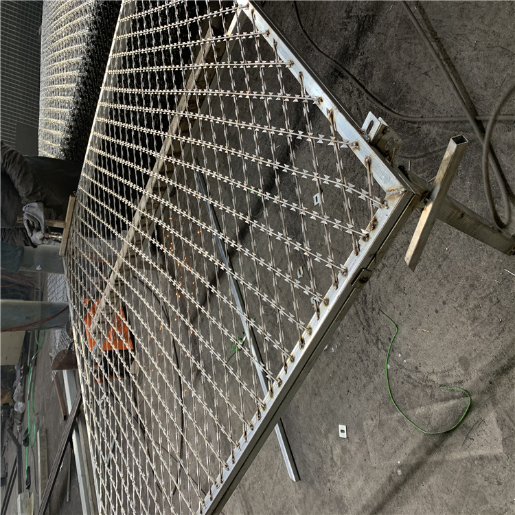 國內監獄、看守所等所采用的巡邏道鋼網墻一般為鐵絲焊接而成,上邊講到的就是鐵絲焊接型,但是也有些設計要求是焊接刀刺網樣式的。