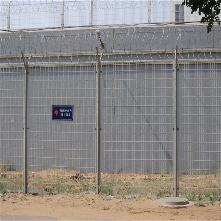 4.蛇腹型螺旋雙交叉式刀刺網(wǎng)安裝形式:將蛇腹型刀刺網(wǎng)架在鋼網(wǎng)墻V型支架上【鋼網(wǎng)墻頂部】,內(nèi)穿兩道3mm粗的浸塑鋼拉絲,刀刺網(wǎng)圈與鋼拉絲的交匯處用浸塑綁絲擰固。